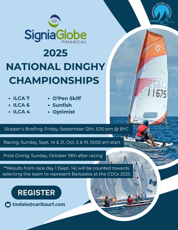 The 2025 SigniaGlobe National Dinghy Championships, organised by the Barbados Sailing Association, are scheduled to take place on Sunday, 14thSeptember, Sunday, 21st September, Sunday, 5th October and Sunday, 19th October, 2025. The Notice of Race and Entry Form are below.